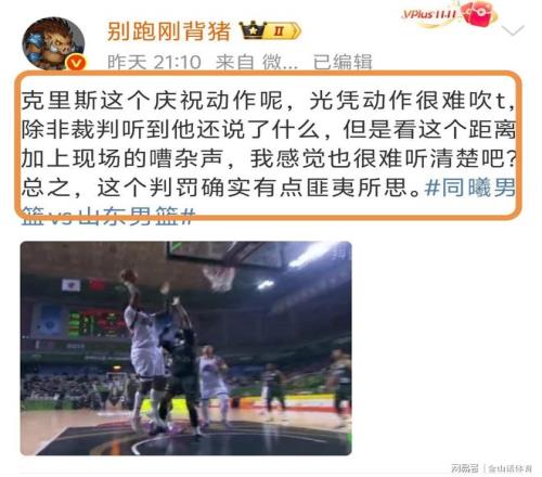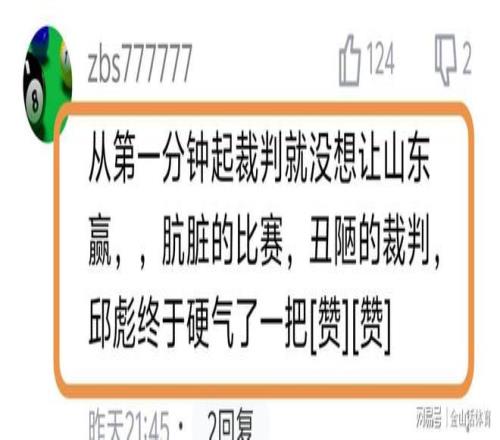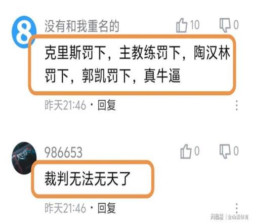 “裁判也真的是尽力了!罚掉山东主帅,罚掉山东主力外援,罚掉两个中锋,给了你那么多罚篮,最后还输十几分!真的丢人!”;“叼着个哨子胡吹,我说心里话”;“克里斯罚下,主教练罚下,陶汉林罚下,郭凯罚下,真牛逼!”;“这主场哨真黑呀!”……